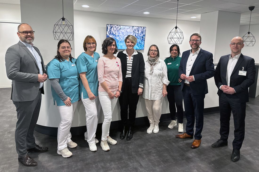 Von links: Christian Quack (Geschäftsführer der Main-Kinzig-Kliniken), MFAs des MVZ Großkrotzenburg, Dr. Lisa Hartmann (Fachärztin für Gynäkologie und Geburtshilfe), Bürgermeisterin GKB Theresa Neumann, Dr. Kaus-Grammel, MFA, Landrat Thorsten Stolz, Jonas Kropac (Kaufm. Leitung MVZ; Recht & Compliance).