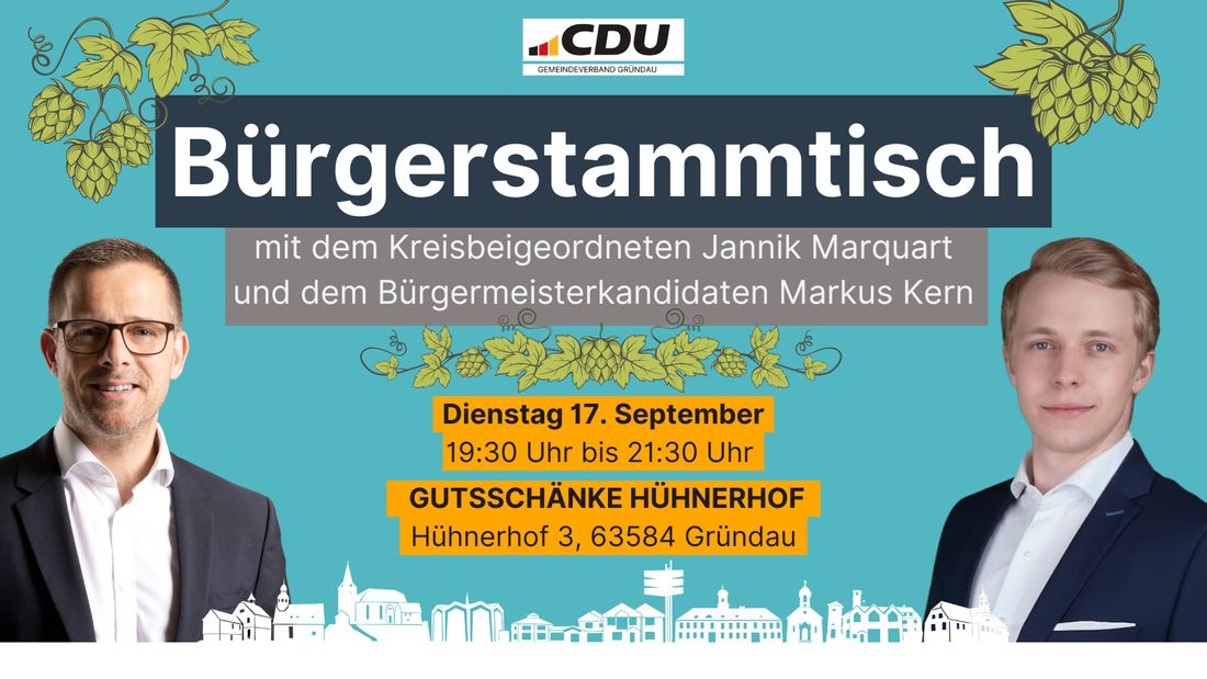 Am 17. September findet ab 19:30 Uhr der Bürgerstammtisch der CDU Gründau in der Gutsschänke Hühnerhof, Gettenbach, statt.