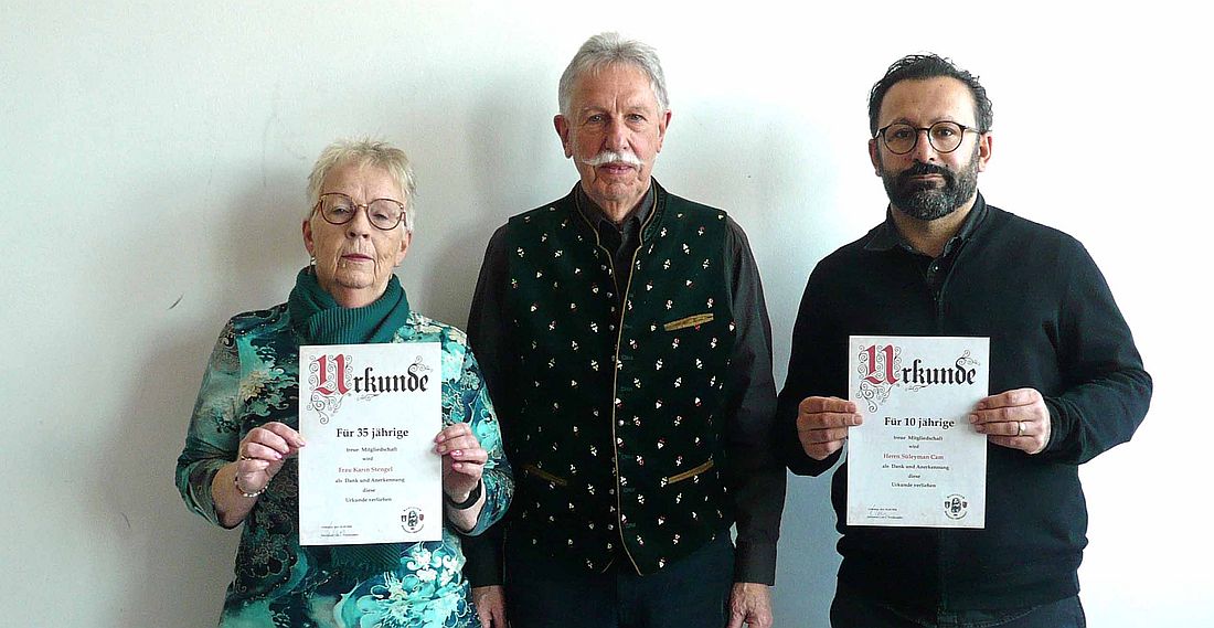 Ehrung der beiden Jubilare des Bartclubs Steinau-Gründau Karin Stengel für 35 Jahre Vereinszugehörigkeit (links) sowie Süleyman Cam für 10 Jahre (rechts) mit Schriftführer Norbert Amon.
