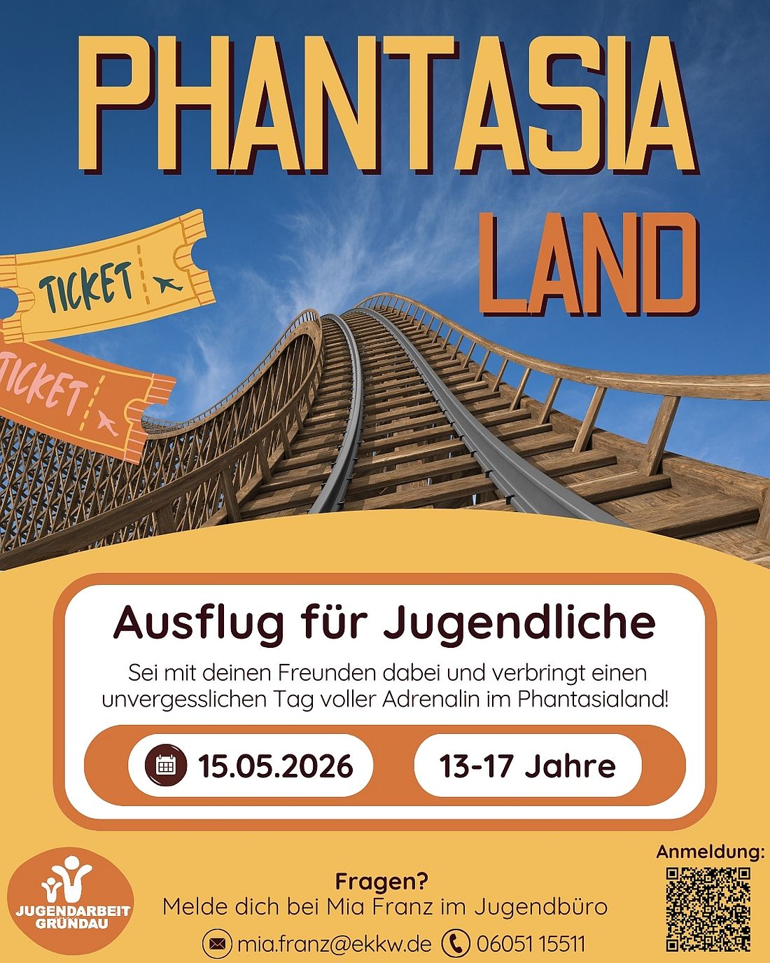 Am Freitag, 15. Mai 2026 (Brückentag nach Christi Himmelfahrt), veranstalten die Jugendarbeit Gründau einen Tagesausflug ins Phantasialand in Brühl.