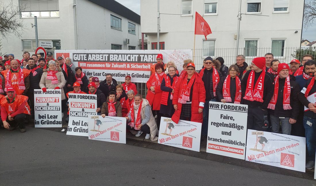Knapp 150 Mitarbeiterinnen und Mitarbeiter der I.G. Bauerhin in Gründau folgten dem Aufruf der IG Metall zu einem Warnstreik für die vor einigen Wochen übergebenen Tarifforderungen. Das traditionsreiche Familienunternehmen wurde im vergangenen Jahr durch die US-amerikanische Lear Corporation übernommen und firmiert seit Ende September unter diesem Namen. Am Standort Gründau entwickeln und fertigen die insgesamt 350 Beschäftigten Sitzheizungen und Sitzkomfortsysteme für die Automobilindustrie.
