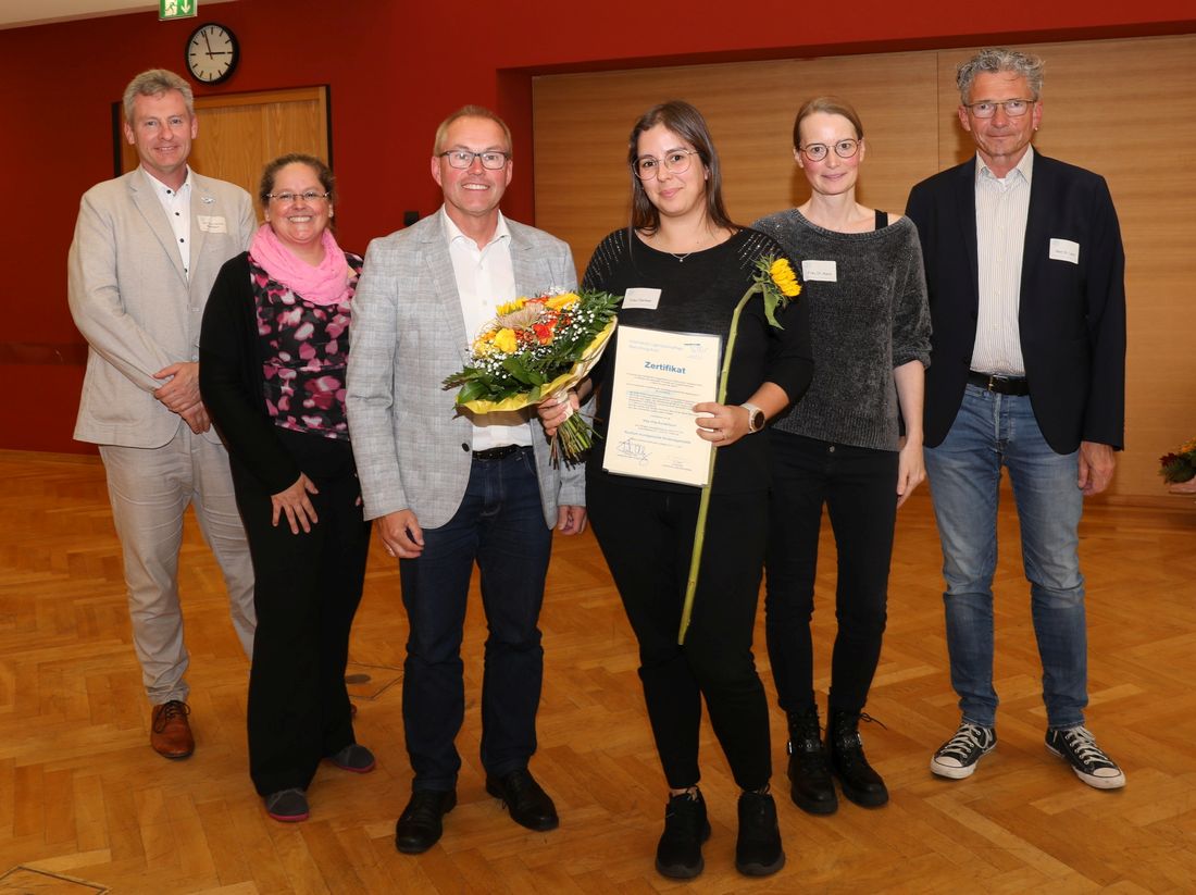 Stellvertretend für das gesamte Team der Villa Kunterbunt nahm Claudia Denker die Zertifizierungsurkunde entgegen. Mit anwesend waren (v.l.) Erster Kreisbeigeordneter Andreas Hofmann, Dr. Gunda Adolphi, Bürgermeister Gerald Helfrich, Dr. Britta Keim und Amtsleiter Dr. Wolfgang Lenz.