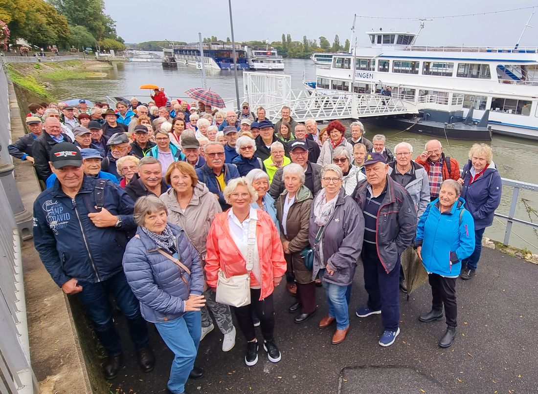 Tolle Stimmung trotz trüben Wetters: Die Gründauer Seniorinnen und Senioren auf Ausflugstour am Rhein in Rüdesheim.
