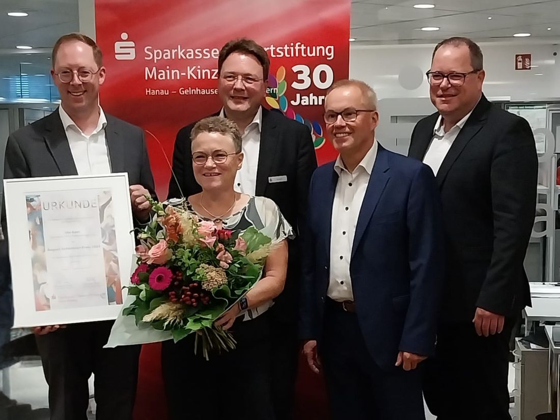 Ute Kern vom TV Rothenbergen wurde mit dem August-Schärttner-Preis ausgezeichnet. v.l. Michael Scragg (Sparkassen-Sportstiftung), Ute Kern, Nils Galle (Sparkasse Hanau), Gerald Helfrich (Bürgermeister) und Ole Schön (Kreissparkasse Gelnhausen).