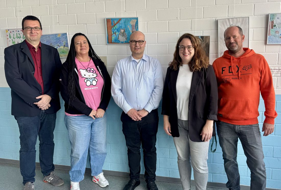 Von links: David Hoke (2. Konrektor), Ramona Jäger (Schulleiterin), Dennis Döhring (stellv. Schulleiter), Lisa Gnadl, Jens Gabler (Lehrer).