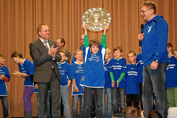 Da staunten die jungen Kicker der E-Jugend nicht schlecht. Bei der Weihnachtsfeier der JSG Gründau am 15.12.2013 bekamen sie aus den Händen des Gründauer Bürgermeisters Gerald Helfrich eine Meisterschale in Originalgröße überreicht.