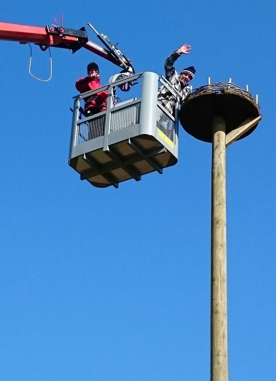 Zwei Brutplattformen wurden vom Vogelschutzverein in Auftrag gegeben und jetzt nach der Lieferung mit Hilfe des Hammersbacher Dachdeckermeisterbetriebs Michael Kraus auf den Masten befestigt. Für die Unterstützung waren die Vogelschützer dankbar, denn ohne schweres Gerät wäre das Vorhaben nicht möglich gewesen. Mit Michael Kraus‘ Kranwagen fiel es dagegen leicht, alle Arbeiten in Höhe der Mastspitzen zu erledigen und die Plattformen sicher anzubringen.