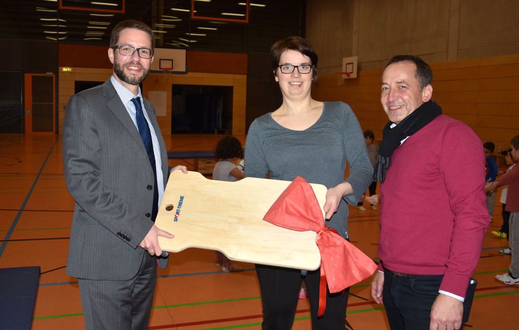 Foto: Landratskandidat Thorsten Stolz (links) überreicht TSV-Übungsleiterin Katharina Vaterodt und TSV-Vorsitzendem Uwe Niemeyer das Rollbrett, das er für das Kinderturnen im Hanauer Traditionsverein gesponsert hat.