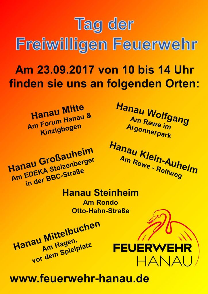 Einen Tag der Freiwilligen Feuerwehr, bei der es um Mitgliederwerbung geht, veranstaltet am kommenden Samstag die Feuerwehr Hanau in allen Stadtteilen in der Zeit von 10:00 bis 14:00 Uhr.