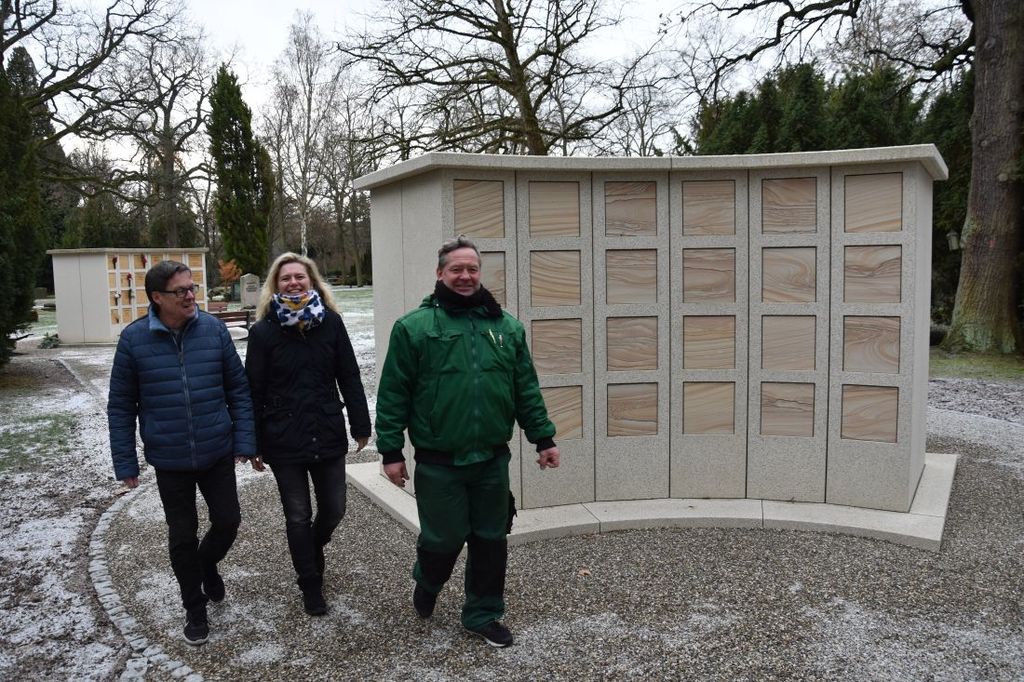 Foto: Lothar Ross von HIS (links) plante die neue Urnenwand, damit Friedhofsleiterin Alexandra Kinski und ihr Stellvertreter Thomas Asbach ein breites Bestattungsangebot haben.