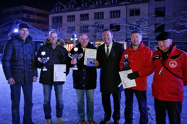 Oberbürgermeister Claus Kaminsky und Steffen Maiwald, der Geschäftsführer der Stadtwerke Hanau, die den Wettbewerb und die Eisbahn sponsern, gratulierten und überreichten die Siegerpokale und Preise. Für den Erstplatzierten gab es eine digitale Fotokamera, die beiden Zweitplatzierten erhielten je einen portablen DVD-Player und der Drittplatzierte ein Internetradio sowie Karten für die Veranstaltungsreihe Kultour. Sportgeräte und Schiedsrichter für die Veranstaltung stellte auch in diesem Jahr wieder der 1. Eisstockschützenverein Maintal-Bischofsheim e.V.