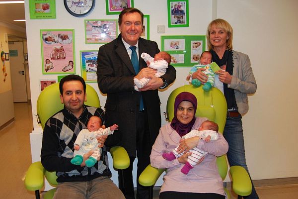 Davon machte sich nun auch Oberbürgermeister Claus Kaminsky ein Bild und besuchte die Vierlinge auf der Früh- und Neugeborenen-Intensivstation des Klinikums Hanau. Der Oberbürgermeister hat die Ehrenpatenschaft für die vier Kleinen übernommen und übereichte Mutter Sevim und Vater Ahmet bei seinem Besuch auf der Neugeborenenintensivstation des Klinikums nun die offiziellen Urkunden. Die Dokumente bestätigen jedem Kind, die vom Oberbürgermeister übernommene Ehrenpatenschaft.