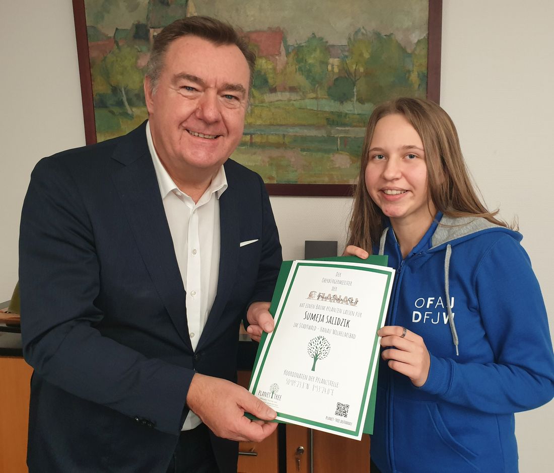 Als Geschenk überreichte Claus Kaminsky Sumeja Salidzik eine Urkunde über einen extra für sie gepflanzten Baum im Stadtwald von Hanau-Wilhelmsbad. Nähere Informationen über das DFJW finden Interessierte unter www.dfjw.org.