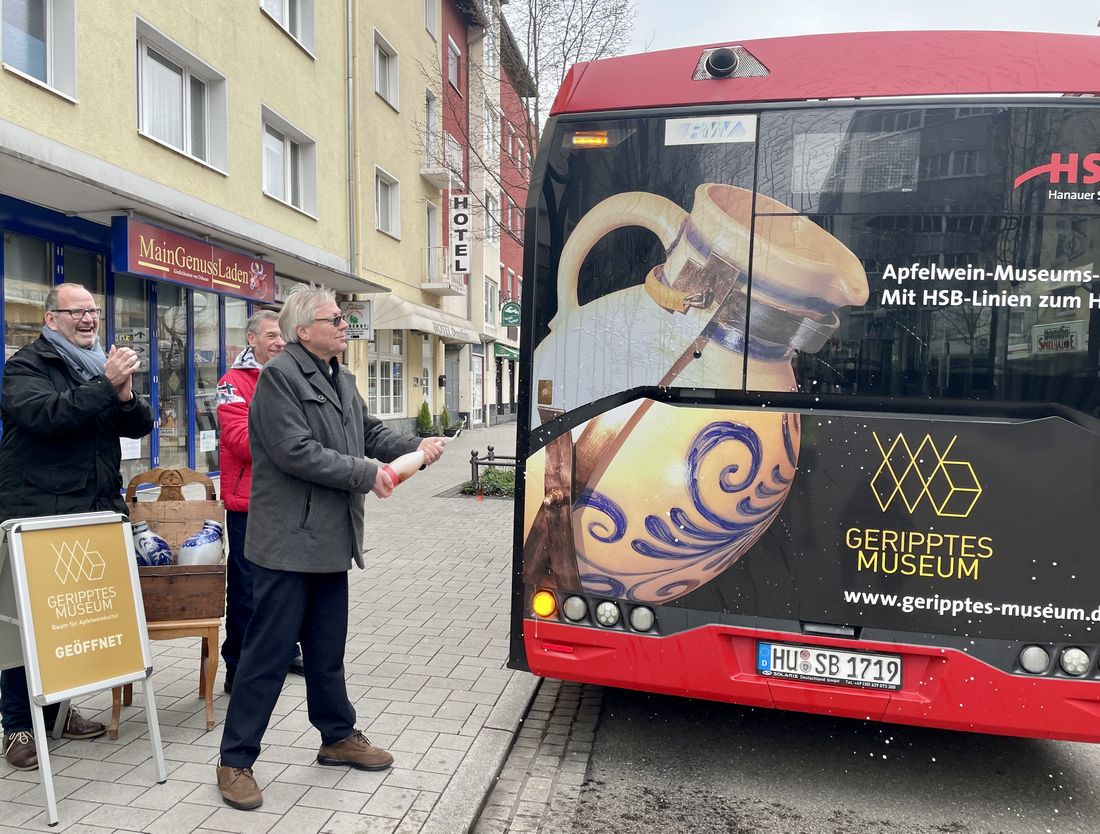 Das nahm stilgerecht HSB-Geschäftsführer Thomas Schulte vor und bespritzte das Busheck mit einem Goldparmänen-Apfelschaumwein, beobachtet von Uwe Berndt, dem Schriftführer des Museumsträgervereins Apfelwein Centrum Hessen (ACH!), und dessen zweiten Vorsitzenden Thomas Seifert. Beim anschließenden Umtrunk im Museum hob Thomas Schulte die Bereitschaft der HSB hervor, lokale kulturelle Einrichtungen zu unterstützen und in der Bevölkerung bekannter zu machen. „Der ‚Bembel-Bus‘ ist ein absoluter Hingucker und wir freuen uns, dass er das ‚Gerippte Museum‘ in Hanau und darüber hinaus in den Fokus rückt. Solche Einrichtungen sind wichtig für das Image der Stadt, die mehr zu bieten hat, als manch Einheimischer und Außenstehender weiß“, betonte der Geschäftsführer.