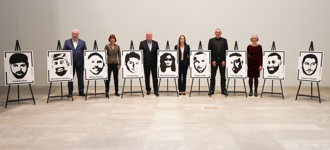Der Hessische Landtag gedachte in dieser Woche der Opfer des Anschlages von Hanau im Jahr 2020. Das Foto zeigt Landtagspräsidentin Astrid Wallmann (Bildmitte) mit den Vizepräsidentinnen und -präsidenten des Landtages (Karin Müller, BÜNDNIS 90/ DIE GRÜNEN, re. im Bild; Dr. Ulrich Wilken, DIE LINKE, 2. v. re.; Frank Lortz, CDU, 3. v. li.; Heike Hofmann, SPD, 2. v. li; Dr. h.c. Jörg-Uwe Hahn, Freie Demokraten, li. im Bild) und mit Bildnissen der Opfer des Anschlages. Bildrechte: Hessischer Landtag