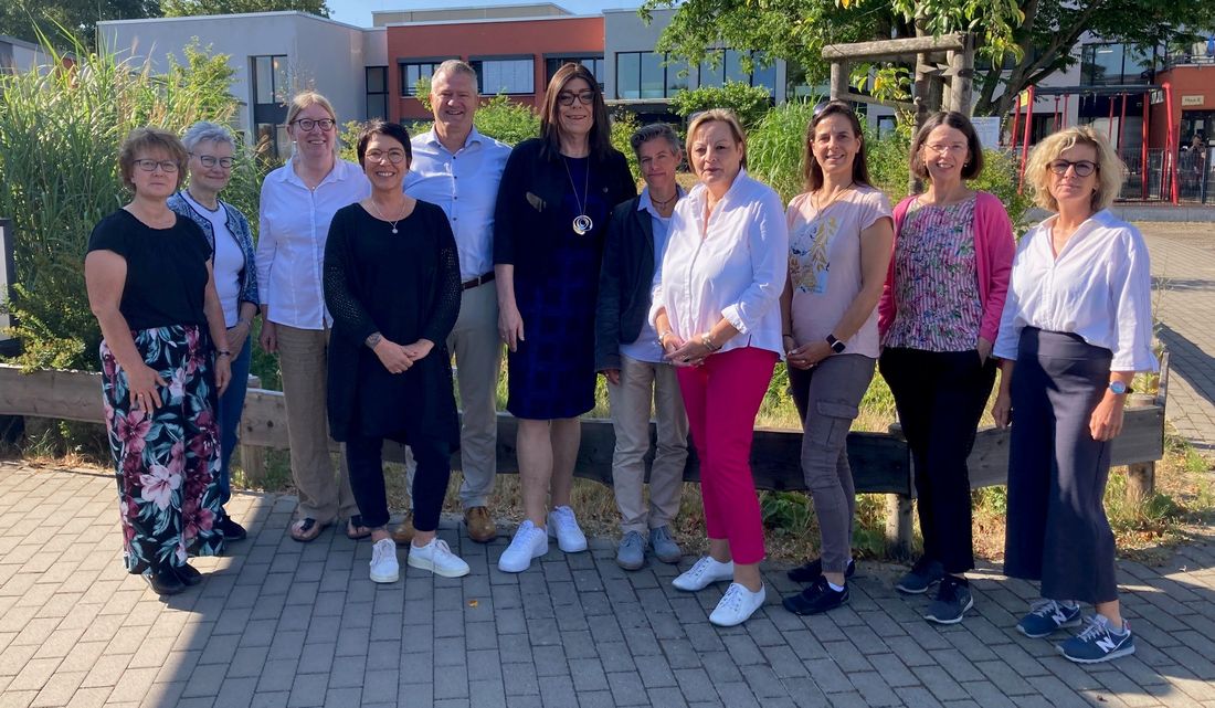 Von links:Treffen des Lokalen Bündnisses für Familien Hanau: Die Mitglieder Anja Staubach (Evonik), Christel E. Sippel (Evangelische Stadtkirchengemeinde Hanau) Michaela Weiß (FAW GmbH), Jasmin Schilling (KCA), Marco Maier (APZ-MKK), Corinna-Maria Schulte (GF. Hanauer Straßenbahn GmbH) Birgit Bernhard (APZ-MKK), Cornelia Gasche (Frauenbeauftragte Hanau) Kirsten Badock-Menz (Interne Gleichstellungsbeauftragte der Stadt Hanau), Simone Brill (Kathinka-Platzhoff-Stiftung) und Eva Sippel (Pilot) vor der Unternehmenszentrale der APZ-MKK.