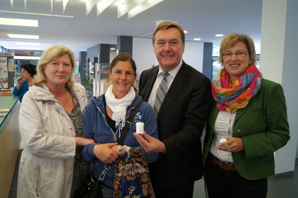 Foto: Oberbürgermeister Claus Kaminsky und Stadtladen-Leiterin Manuela Pfirrmann (rechts) , beide mit Bti-Tablettenbehältern in der Hand, ließen sich von Hanauer Bürgerinnen und Bürgern ihre Mücken-Nöte erläutern.