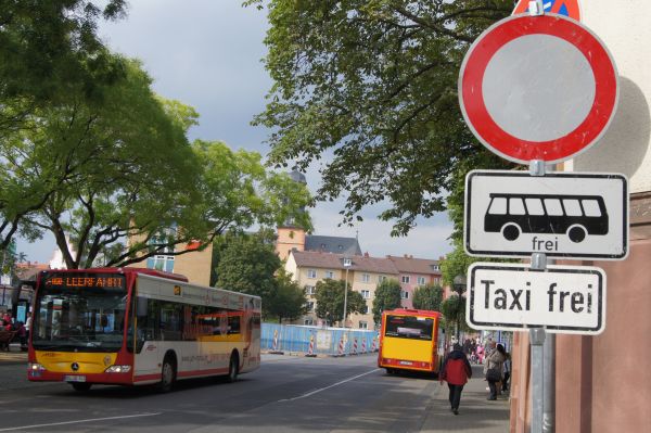 Die Straße vor dem Finanzamt hat Hanaus Straßenverkehrsbehörde nunmehr für den Durchgangsverkehr gesperrt, damit die Fahrgäste auf dem Zentralen Busbahnhof diese Fahrbahn gefahrloser queren können.