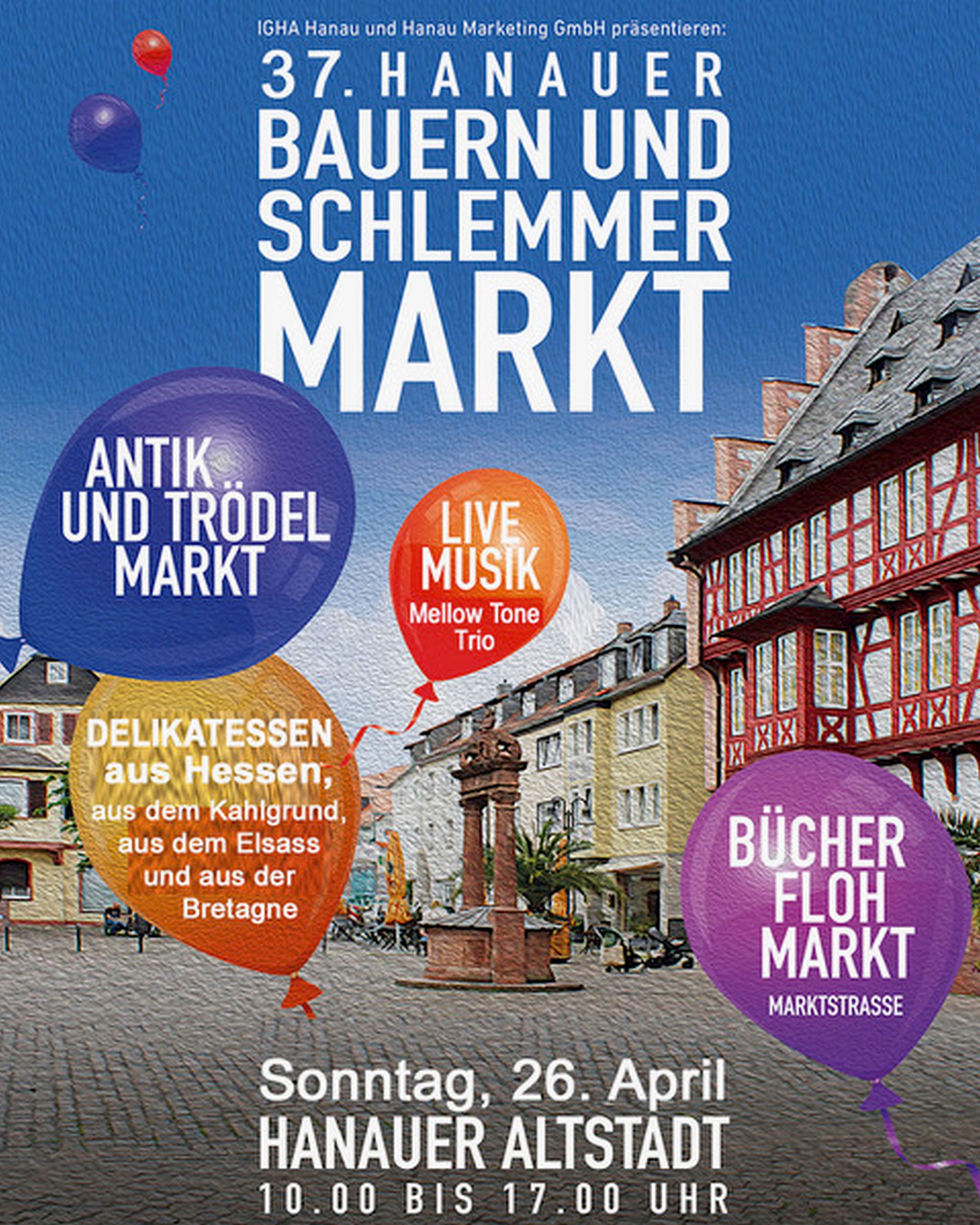 Am Sonntag, 26. April, lädt die Interessengemeinschaft Hanauer Altstadt e.V. (IGHA) zu ihrem 37. Bauern-& Schlemmermarkt, zum traditionellen Bücherflohmarkt und zu dem einmaligen Antik- und Trödelmarkt von 10 – 17 Uhr in die Hanauer Altstadt von der Marktstraße bis zum Schlossplatz ein.