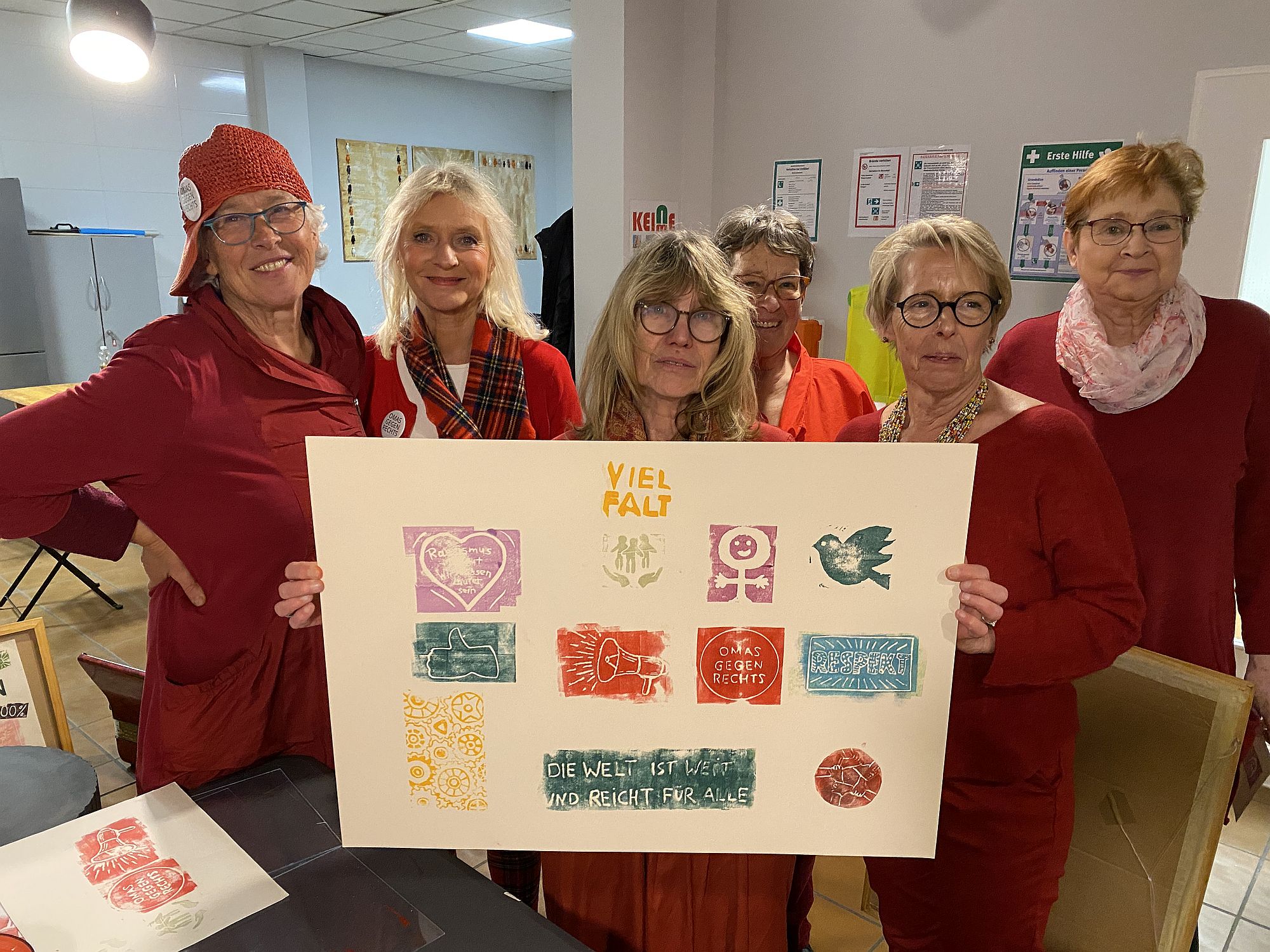 Beim Finale am 27. März flossen die Einzelarbeiten dann zu einem langen Gemeinschafts-Druck / Kunstwerk zusammen. Die Symbole für Frieden, Freiheit und Inklusion wurden nicht nur gedruckt, sondern auch im Dialog erarbeitet. Eine Teilnehmerin brachte es auf den Punkt: „Vielfalt existiert bereits, aber für ein echtes Miteinander braucht es Respekt und Gemeinschaft als verbindende Puzzleteile.“ Besonders in diesen unruhigen Zeiten, waren sich alle einig, ist es umso wichtiger, sich zusammen für demokratische Werte und eine aktive Stadtgemeinschaft einzusetzen.