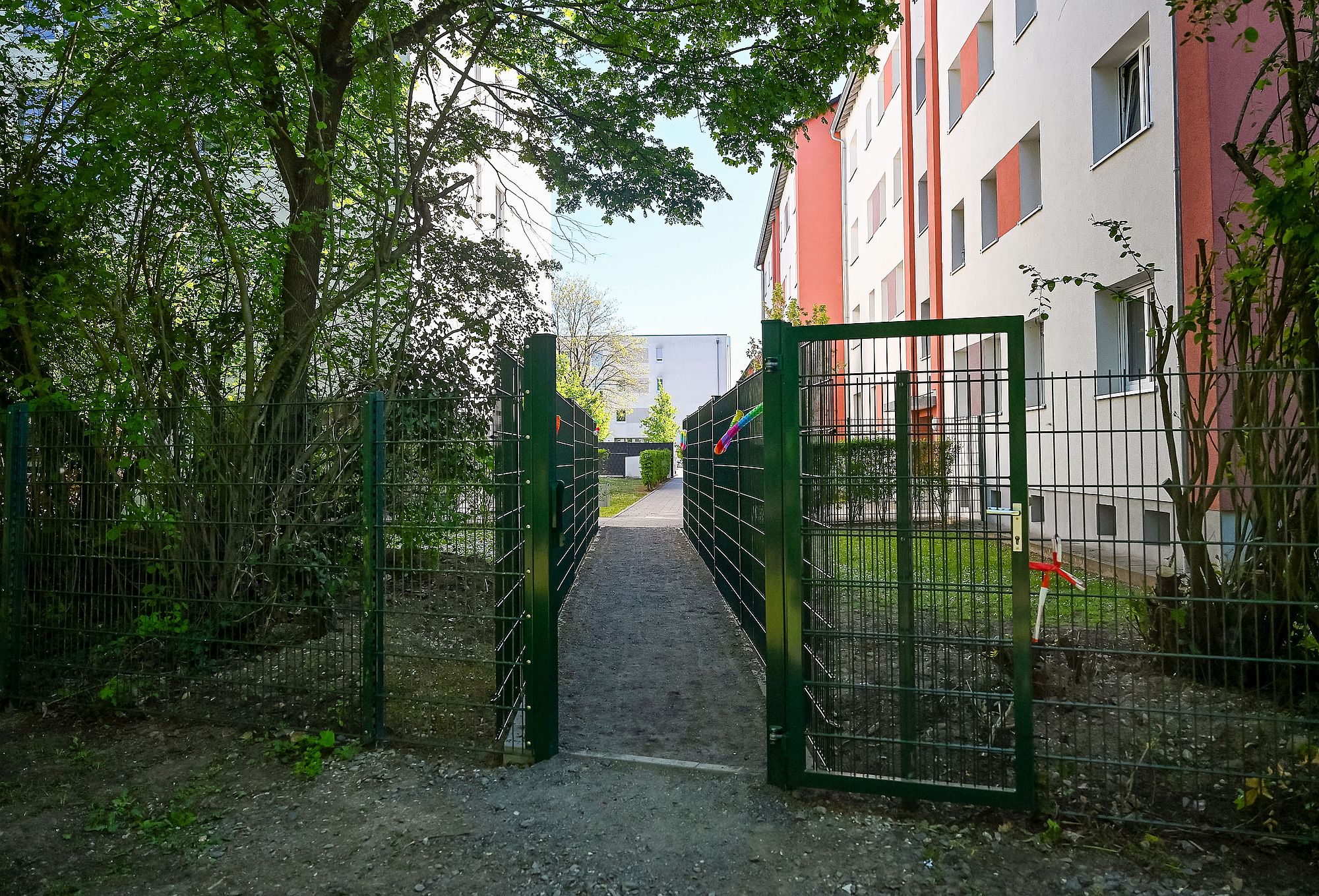 Die Baugesellschaft Hanau GmbH hat zwischen den Mehrfamilienhäusern in der Antoniterstraße im Quartier am Nordbahnhof und dem dort gelegenen, öffentlichen Spielplatz einen neuen Durchgang geschaffen.