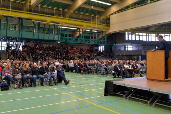 Nur die August-Schärttner-Halle hatte ausreichend Platz für die mehr als 1.000 Menschen geboten, die an der Zusammenkunft teilnahmen und die in dieser Größe ein Novum war. Doch dem OB war es nach eigenen Worten ein besonderes Anliegen, allen Spekulationen oder Ängsten, die wegen des angekündigten 20prozentigen Stellenabbaus entstehen könnten, entgegenzutreten. "Ich halte daran fest, dass es keine betriebsbedingten Kündigungen geben wird", bekräftigte Kaminsky sein Versprechen an die Belegschaft. Gleichzeitig kündigte er an, dass trotz des absoluten Einstellungsstopps die jungen Mitarbeiterinnen und Mitarbeiter, die in den nächsten Monaten ihre Ausbildung beenden, einen für sechs Monate befristeten Arbeitsvertrag bekommen, "um ihnen die Freiheit zu verschaffen, sich zunächst voll auf die Prüfungen konzentrieren zu können, ohne parallel auf Arbeitsplatzsuche gehen zu müssen".