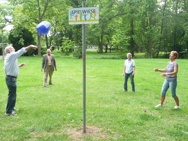 Die BfH-Vertreter im Ortsbeirat Innenstadt Martin Dittmar, Klaudia Mänz und Siegfried Koch besuchten das Gelände im Schlossgarten. Ein Schild am Eingang weist darauf hin, dass Ball spielen auf dem Rassen verboten ist. Auf der Spielwiese, direkt neben dem Paulanergarten, ist das anders. Hier sind Ballspiele aller Art ausdrücklich erlaubt. Die Schulleiterin und Vorsitzenden des Präventionsrats Frau Stübing hält es für falsch immer und alles zu verbieten. Man müsse vor allem Kindern und Jugendlichen Gelegenheit geben sich im öffentlichen Raum spielerisch zu betätigen und auszutoben. Bewegung sei die Grundlage zur Bildung, betont sie. Eine gute Sache, findet auch Siegfried Koch, habe man hier doch einen weiteren Schritt in Richtung einer lebenswerten Innenstadt getan.