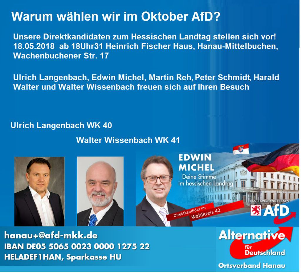 Für den Wahlkreis 40 wurden die beiden Kreistagsabgeordneten Ulrich Langenbach und Peter Schmidt (Ersatzkandidat) eingeladen. Den Wahlkreis 42 repräsentieren der Kreistagsabgeordnete Edwin Michel und der Schatzmeister des Kreisverbandes, Martin Reh, als Ersatzkandidat. "Michel wird als aussichtsreichster AfD-Direktkandidat in ganz Hessen gehandelt. Tritt er doch im traditionell tiefblauen Ostkreis an, und ist durch jahrzehntelange SPD-Mitgliedschaft bestens vernetzt"; so die AfD.