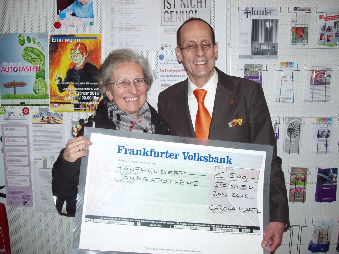 In diesem Jahr konnten die Kunden der Burgapotheke wieder jeden Tag gegen 10 Cents Spende ein Türchen ihres Kalenders öffnen. Bei jedem Gewinn war die Freude groß. Groß war sie auch bei Burkhard Huwe, der im neuen Jahr, den durch die Familie Hartl noch aufgestockten Spendenbetrag, von 500,00 Euro für das Steinheimer Familien- und Generationenzentrum entgegen nehmen durfte.