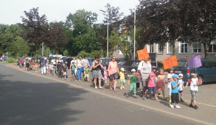 30 Mädchen und Jungen, Eltern und Erzieherinnen inszenierten ihren Umzug mit einer kleinen Menschenschlange von der Elisabeth-Schmitz-Schule in ihre umgebaute und sanierte Kindertagesstätte in der Friedrich-Fröbel-Straße. Für ein Jahr mussten Kindergarten- und Hortkinder ihr Domizil im Osten des Stadtteils verlassen. Nach der Sommerpause am 18. August stehen 130 Plätze für die Altersgruppen 0 bis 14 Jahre zur Verfügung.
