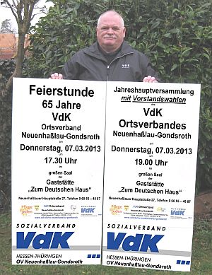 Foto: Der Vorsitzende Helmut Müller mit den Plakaten zur Feierstunde und zur Jahreshauptversammlung am 07.03.2013.