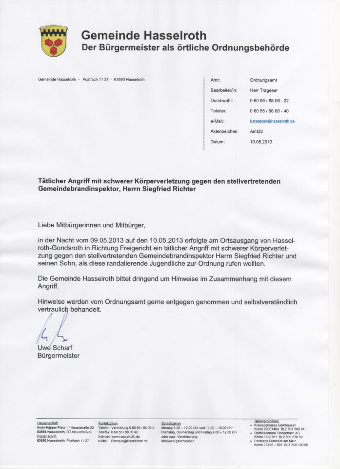 In der Gemeinde Hasselroth ist es am Himmelfahrtstag offenbar zu einer tätlichen Auseinandersetzung gekommen. Laut einem Schreiben von Bürgermeister Uwe Scharf sind der stellvertretende Gemeindebrandinspektor Siegfried Richter und sein Sohn in der Nacht vom 9. auf dem 10. Mai 2013 tätlich angegriffen worden, als sie randalierende Jugendliche zur Ordnung rufen wollten.