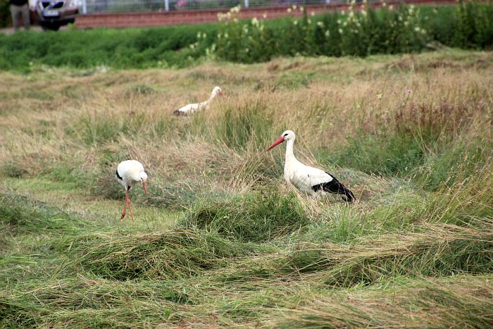 Die Mäharbeiten der Landwirte in Hasselroth lockten am Donnerstag zahlreiche Störche an.