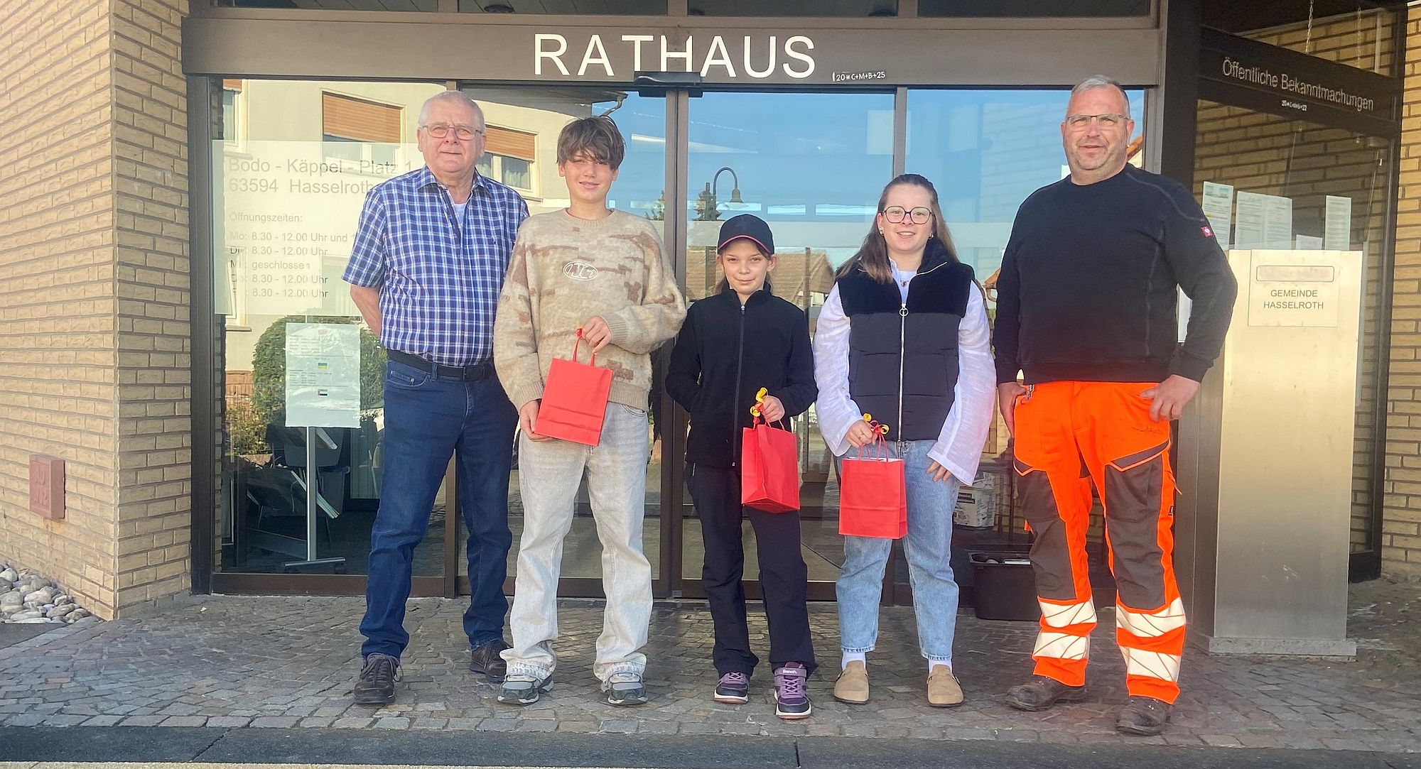 Von links: Hauptamtsleiter Siegfried Richter, Schüler Moritz Schilling, Emily Matzek, Schülerin Nora Schoettle und Bauhofsleiter Thorsten Frieske.