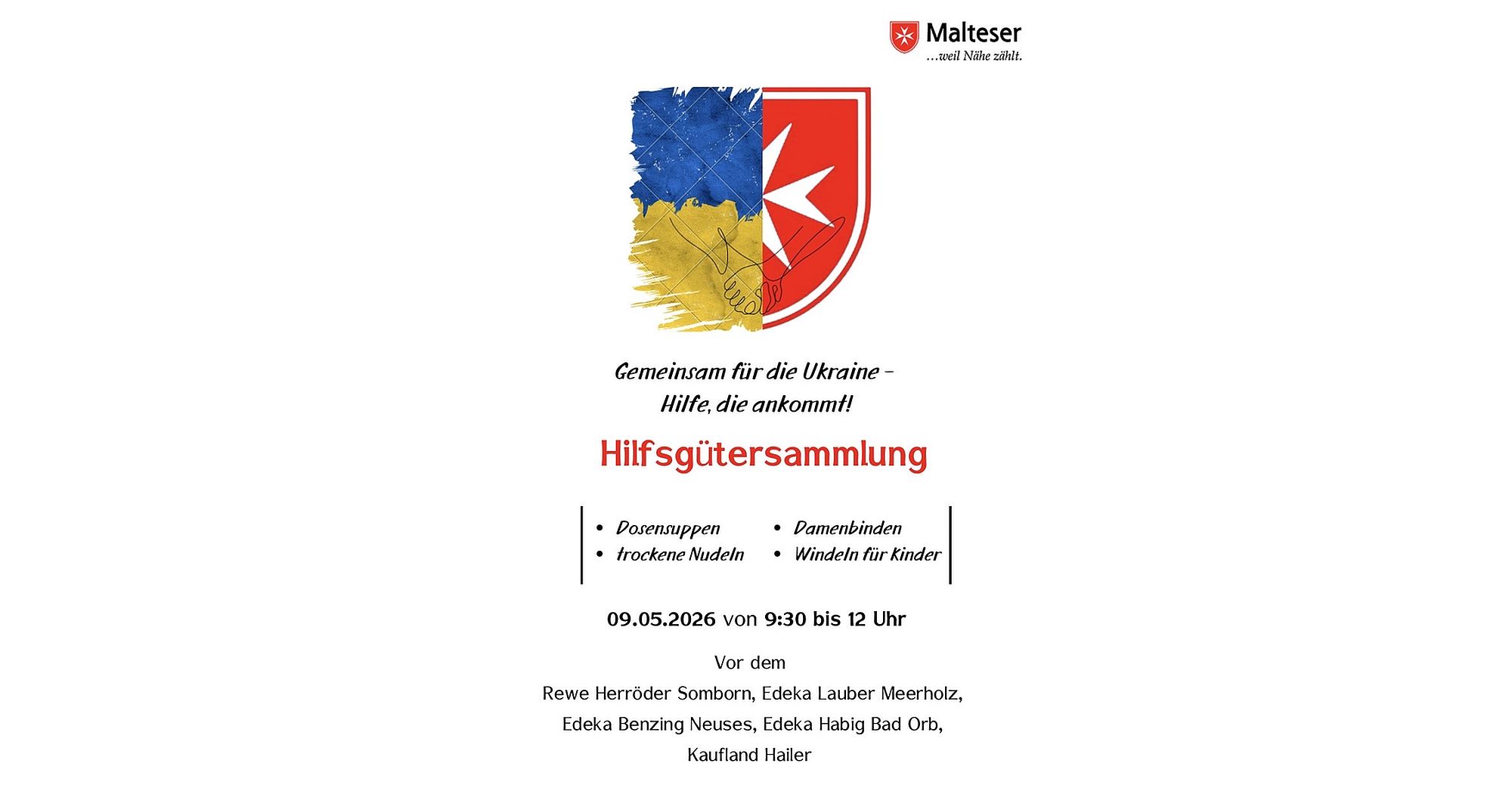 "Am 09. Mai 2026 finden Sie die Malteser aus Hasselroth/Freigericht, in der Zeit von 09:30 Uhr bis 12:00 Uhr an den Lebensmittelmärkten EDEKA Lauber, Benzing und Habig, bei REWE Herröder und am Kaufland Gelnhausen", heißt es in einer Mitteilung.