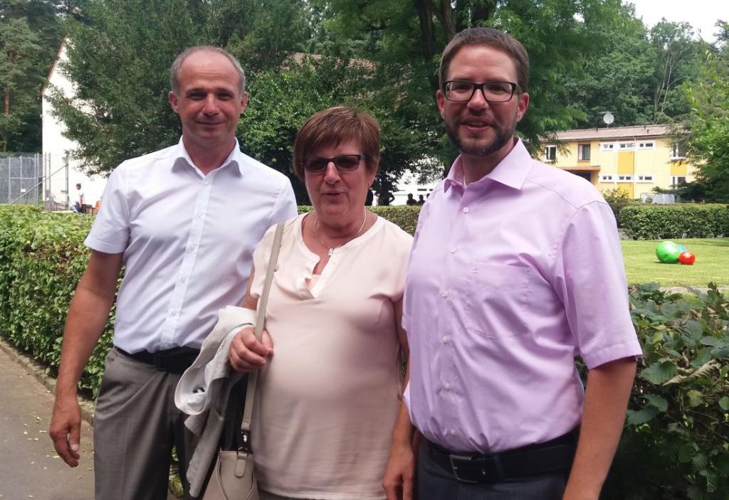 Foto: Im Rahmen des Sommerfestes besuchte der designierte Landratskandidat der SPD-Main-Kinzig, Thorsten Stolz (rechts), zusammen mit der bildungspolitischen Sprecherin der SPD, Uta Böckel (Mitte), die Fördereinrichtung für junge Zugewanderte in der Gemeinde Hasselroth. Einrichtungsleiter Michael König (links) stellte die Einrichtung und ihre umfangreichen Bildungs- und Qualifizierungsangebote vor.