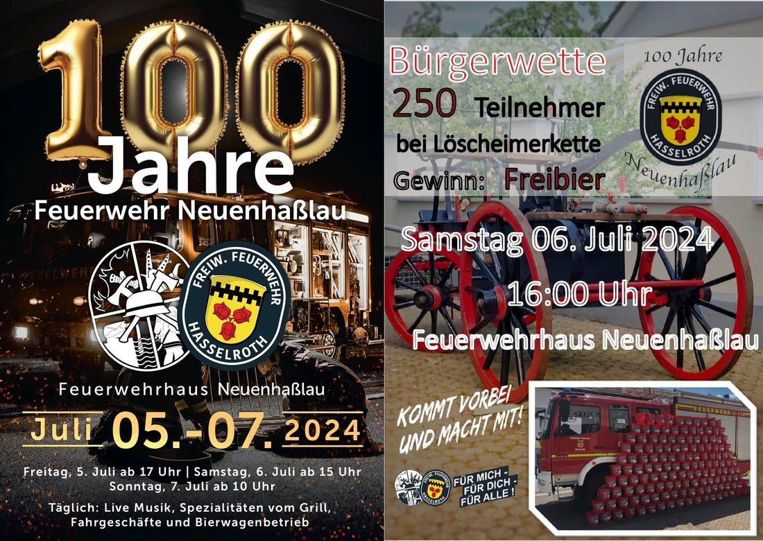 Mit einem Jubiläumswochenende feiert die Freiwillige Feuerwehr Neuenhaßlau vom 5. bis 7. Juli ihr 100-jähriges Bestehen. Rund um das Feuerwehrhaus in der Kirchgasse beginnt der Festbetrieb am Freitag, 5. Juli, um 17 Uhr, am Samstag geht es um 15 Uhr und am Sonntag um 10 Uhr weiter. Für ihre Gäste hat sich die Feuerwehr einiges einfallens lassen: Täglich Livemusik, Spezialitäten vom Grill, Bierwagenbetrieb, Fahrgeschäftebetrieb (Kinderkarussell und Schiffschaukel), ein Weindorf und vieles mehr.