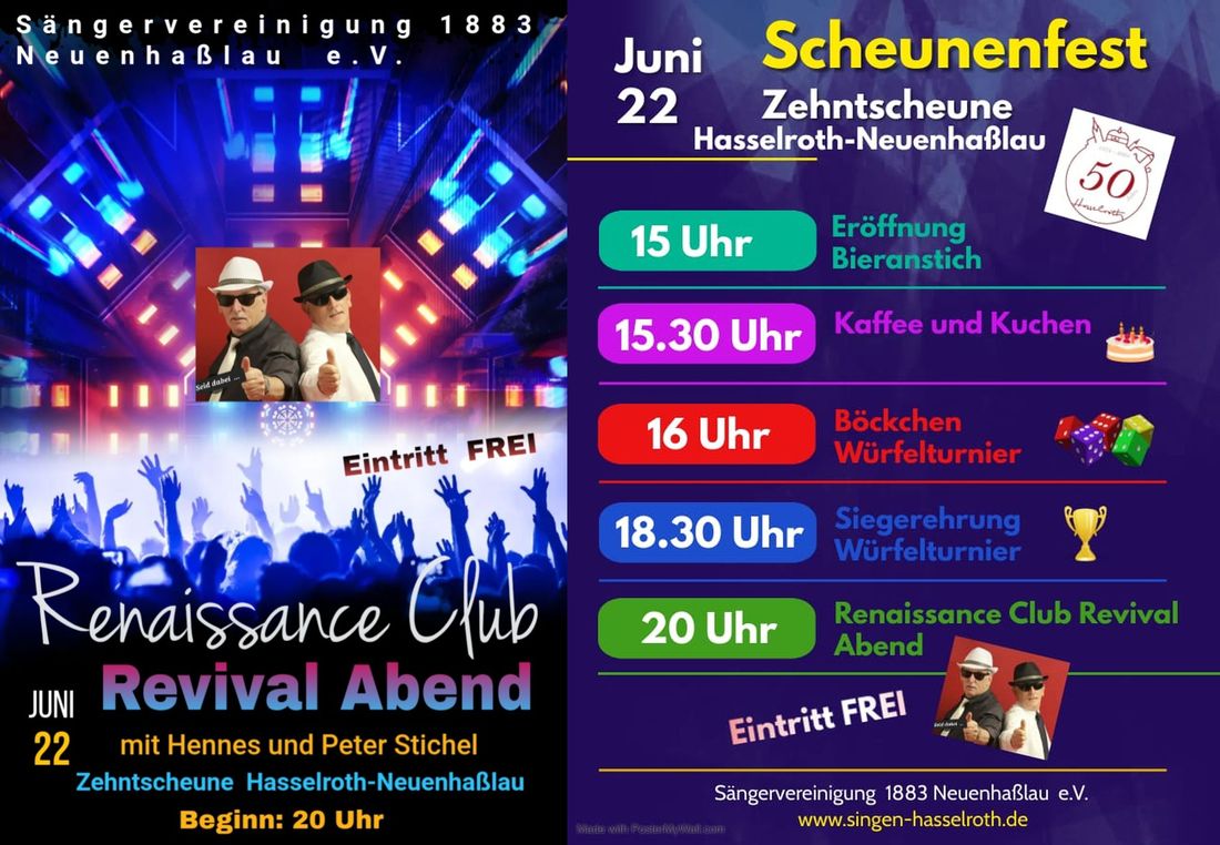 Am 22. Juni 2024 fand unter dem Motto „50 Jahre Hasselroth“ in der Zehntscheune Neuenhaßlau ein unvergesslicher Renaissance Club Revival Abend mit den DJs Hennes und Peter Stichel statt. Das Event lockte zahlreiche Besucher an und sorgte für ein volles Haus. Der renommierte DJ Hennes Stichel, der vor 52 Jahren im zarten Alter von 22 Jahren erstmals an den Plattentellern stand, begeisterte gemeinsam mit seinem Bruder Peter das Publikum mit einem mitreißenden Set aus den besten Hits vergangener Zeiten.