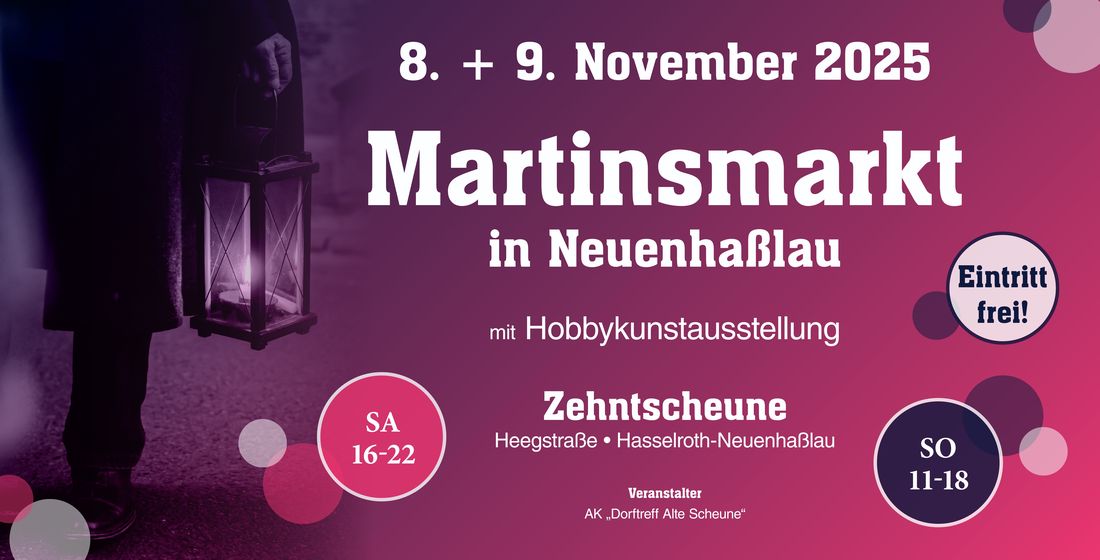 Glühweinduft und Lichterglanz verspricht der Martinsmarkt in und um die Zehntscheune in Neuenhaßlau am 08. November 2025 von 16 bis 22 Uhr und am 09. November 2025 von 11 bis 18 Uhr.
