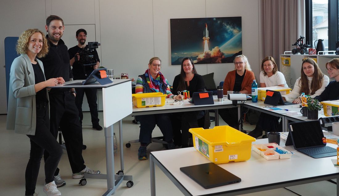 Kathrin Noll (links) und Daniel Daub (Zweiter von links), Leitungsteam des Medienzentrums des Main-Kinzig-Kreises, begeistert die Lehrkräfte der Auwiesenschule aus Hasselroth beim Pädagogischen Tag im Medienzentrum.