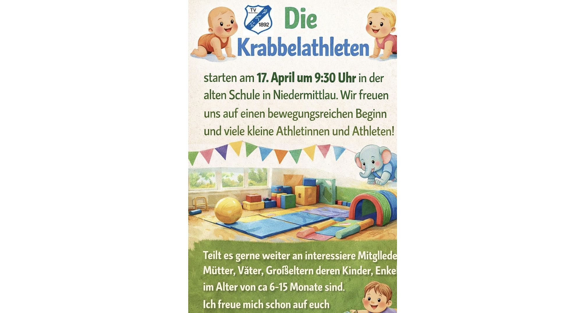 Die Gruppe „Krabbelathleten“ richtet sich an Kinder im Alter von ca. 6 bis ca. 16 Monaten. Immer freitags von 9.30-10.30 Uhr können Mütter oder Väter mit ihren Kleinstkindern an der Krabbelgruppe in der Alten Schule Niedermittlau (bei der Feuerwehr) teilnehmen. Verantwortliche Übungsleiterin ist Diana Schmalz-Hasenauer, zertifizierte Übungsleiterin im Eltern-Kind-Turnen und selbst Mutter eines Jungen.