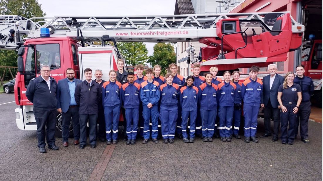 Die erfolgreichen Jugendlichen unter anderem mit Freigerichts Gemeindebrandinspektor Harald Hellenbrand (ganz links) und Bürgermeister Waldemar Gogel (2.v.l.). Dem Vorsitzender der Freigerichter Gemeindevertretung Hugo Klein, (3.v.r.) und der Betreuerin der Jugendfeuerwehr Gondsroth Nicole Roznik (2.v.r.).