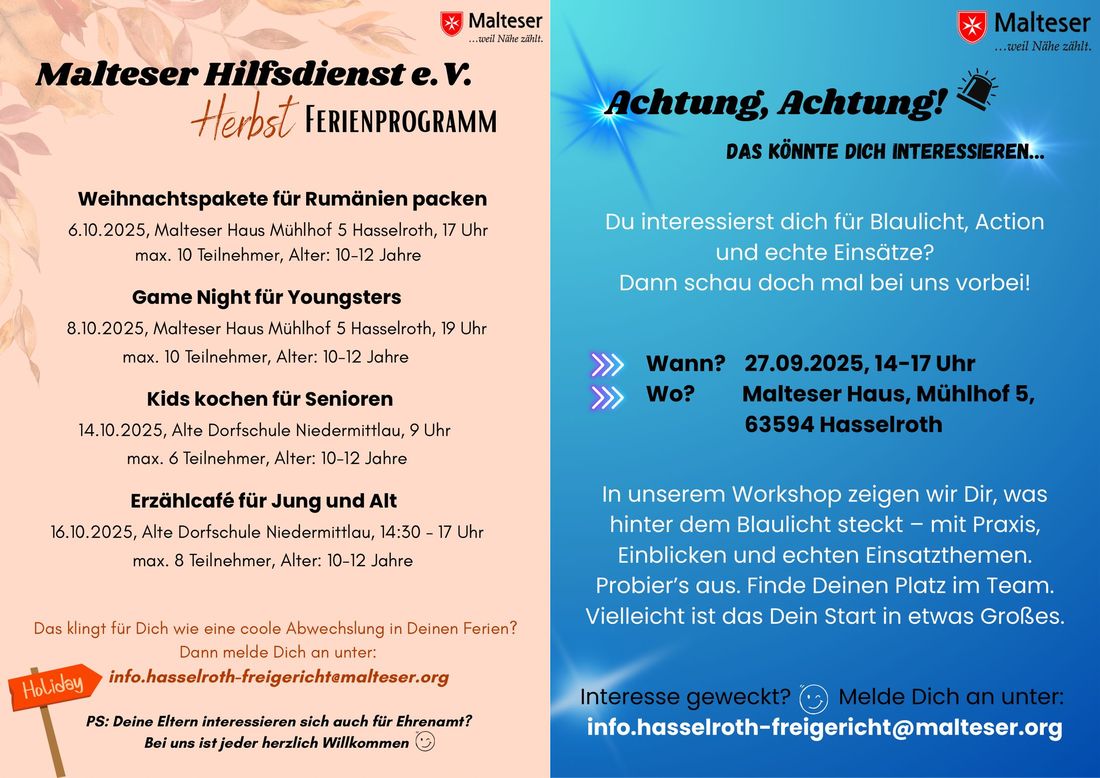 "Du bist 14 Jahre und möchtest mal sehen wie so ein Sanitätsdienst bei einer Veranstaltung funktioniert oder wie ein Einsatz im Katastrophenschutz abläuft, dann laden wir Dich ein, am 27.09.2025 um 14:00 Uhr ans Malteser Haus in Gondsroth, Mühlhof 5 zu kommen. Im Rahmen eines Workshops – Nachmittages stellen wir Dir unsere Einsatzdienste vor", heißt es in einer Mitteilung der Malteser.