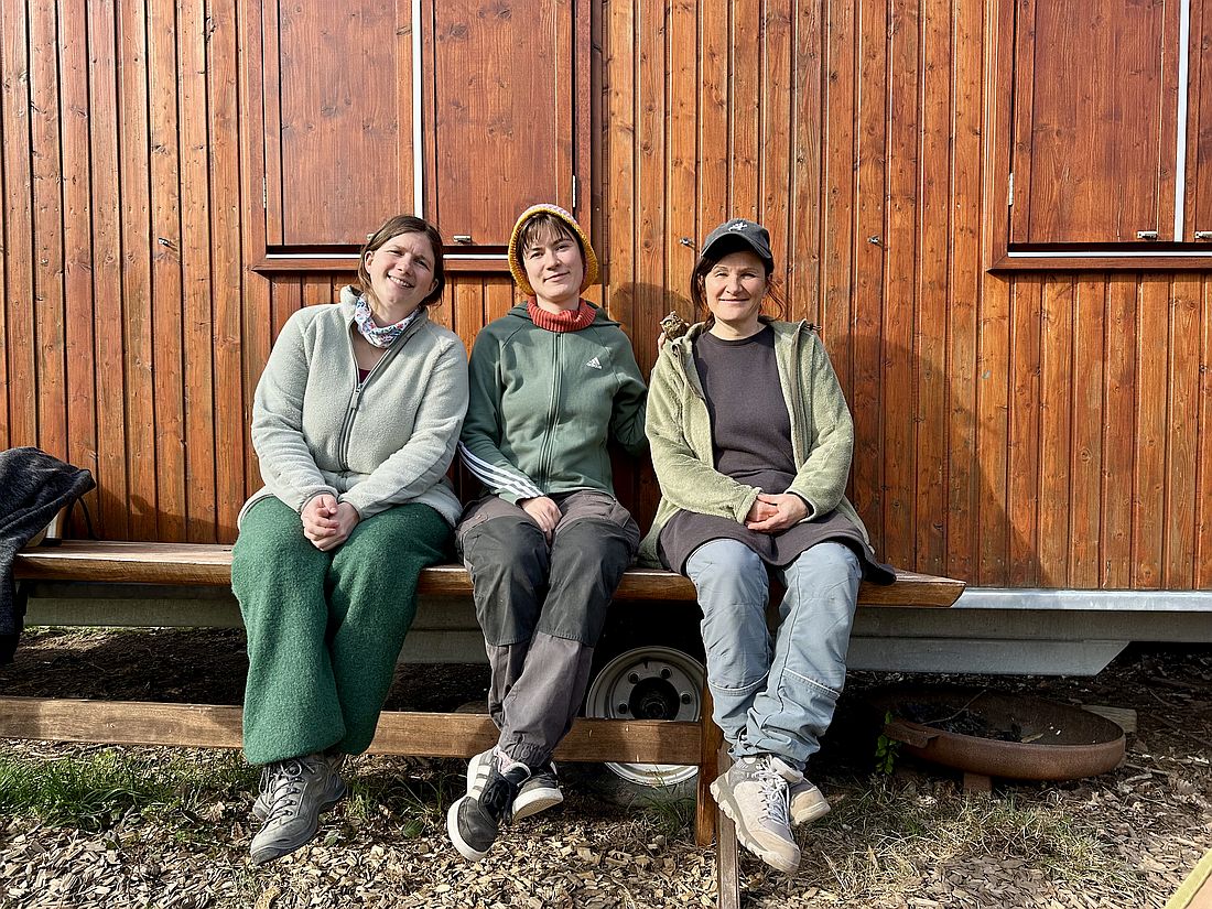 Die Erzieherinnen Verena Kühn, Sophie Patzschke und Michaela Jensen freuen sich über das zehnjährige Bestehen des Waldkindergartens Langenselbold.