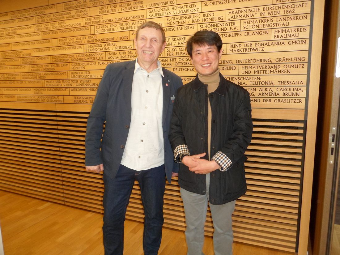 Bernd Klippel aus Linsengericht, gewähltes Mitglied der Bundesversammlung der Sudetendeutschen Landsmannschaft, Kreis-Obmann für den Altkreis Gelnhausen sowie aktives Mitglied in der Seliger-Gemeinde und Suhyun, ehemaliger Offizier der südkoreanischen Armee beim herzlichen Wiedersehen in München.