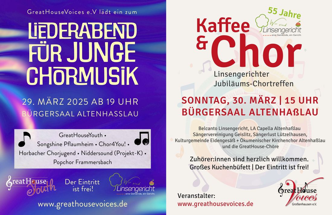 Mit einem Liederabend für Junge Chormusik und einer Sonderausgabe des Linsengerichter Chortreffens unter dem Motto „Kaffee und Chor“ begehen die GreatHouseVoices mit befreundeten Chören aus der Region am letzten März-Wochenende das 55. Jubiläum der Gemeinde Linsengericht.