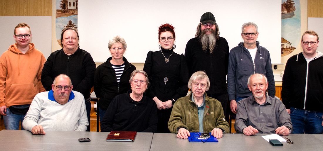Der jetzt gewählte Vorstand des Radio-Museums Linsengericht e.V.: In der vorderen Reihe (von links): Hans-Jörg Vogler, Dietmar Ehrhardt, Wolfgang Ruf und Gerold Welzel, in der hinteren Reihe (von links): Beck, Luca Best, Herbert Dvorak, Kerstin Beck, Kathrin Henkel, Wolfram Henkel, Mathias Best und Tristan Antonowitsch.