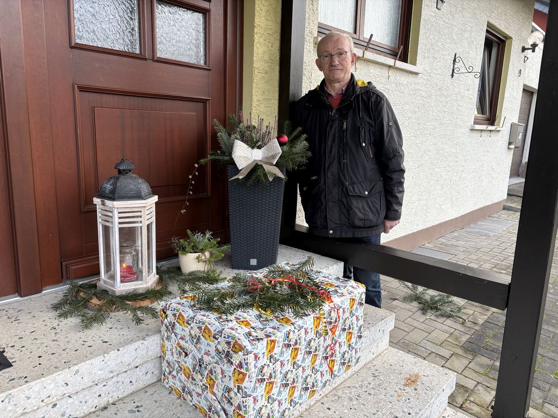 Heinz Breitenbach, Vorsitzender der Partnerschaftskommission Alsónána der Gemeinde Linsengericht, mit dem Weihnachtspaket für den Kindergarten Alsónána.