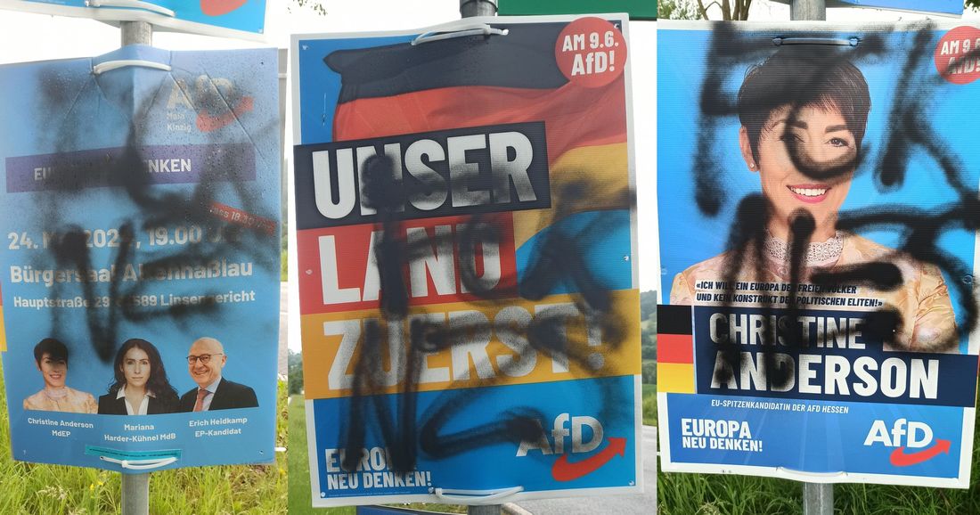 Die AfD wirbt derzeit auf Plakaten mit ihren hessischen AfD-Spitzenkandidaten zur Europawahl und deren stellvertretenden Bundessprecherin Mariana Harder-Kühnel für eine Wahlveranstaltung am Freitag, 24. Mai, im Bürgersaal Linsengericht-Altenhaßlau. Nun wurden erneut Plakate der AfD in Linsengericht verunstaltet und zerstört.