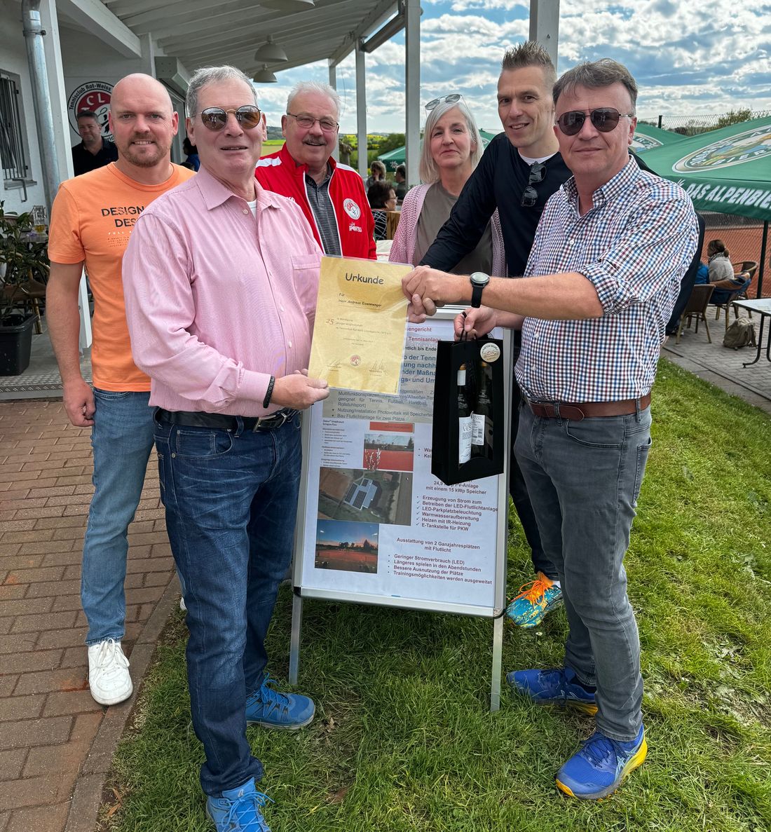 Mitgliederehrung am Rande der Saisoneröffnung: Dr. Andreas Eisenmenger (rechts) erhielt von Vorstandsmitgliedern, anlässlich seiner 25jährigen Vereinsmitgliedschaft, eine Urkunde sowie das traditionelle Rot- und Weißweingeschenk, passend zu den Vereinsfarben.
